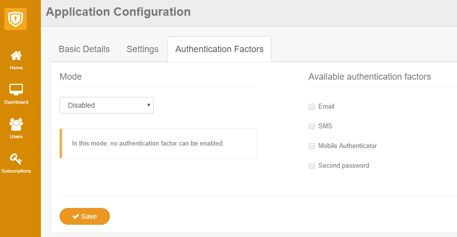 Authentication factors are disabled by default when you create an application, but it's really easy to enable them by navigating to the Application Settings page and choosing the Authentication Factors tab: