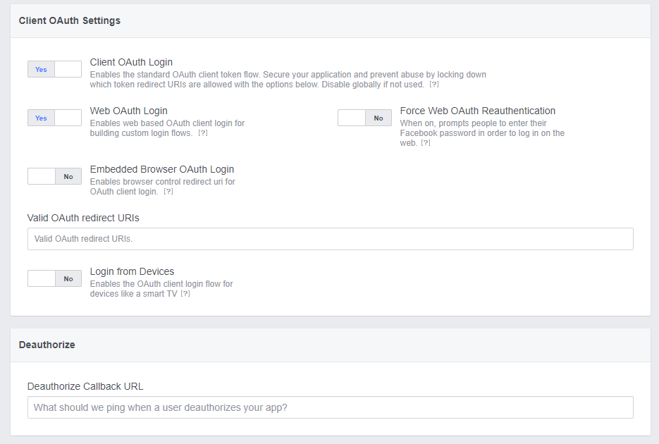 Fill the Valid OAuth redirect URIs with the Redirect URI provided by TCMSP GrantID External Provider's page, available in the Facebook panel, and select Save Changes.