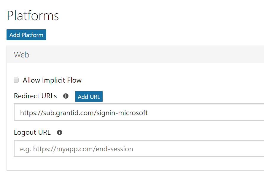 A new panel named Web will be created under the Platforms section. The Redirect URL is available in the Microsoft panel of the TCMSP GrantID External Provider's page.